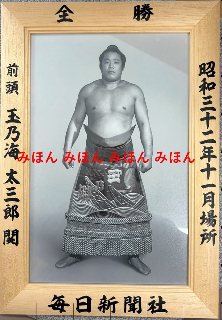 昭和32(1957)年11月場所で全勝優勝した、前頭 玉乃海太三郎関の優勝額ミニチュア版です。